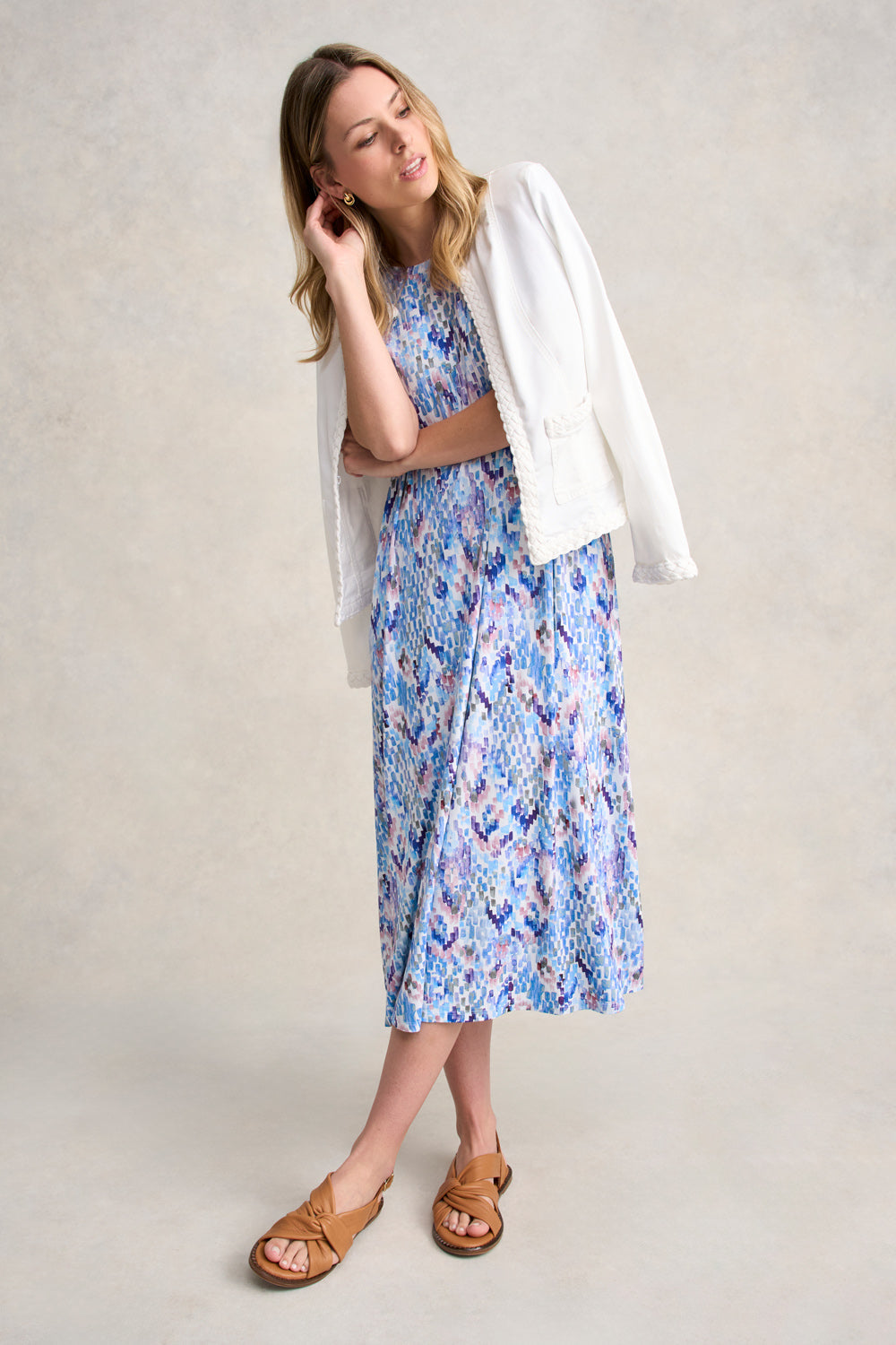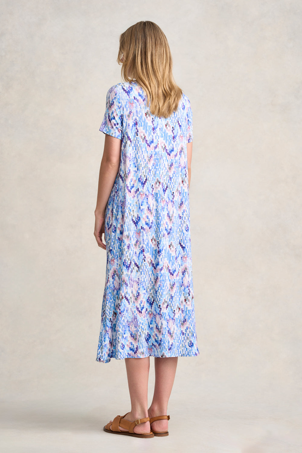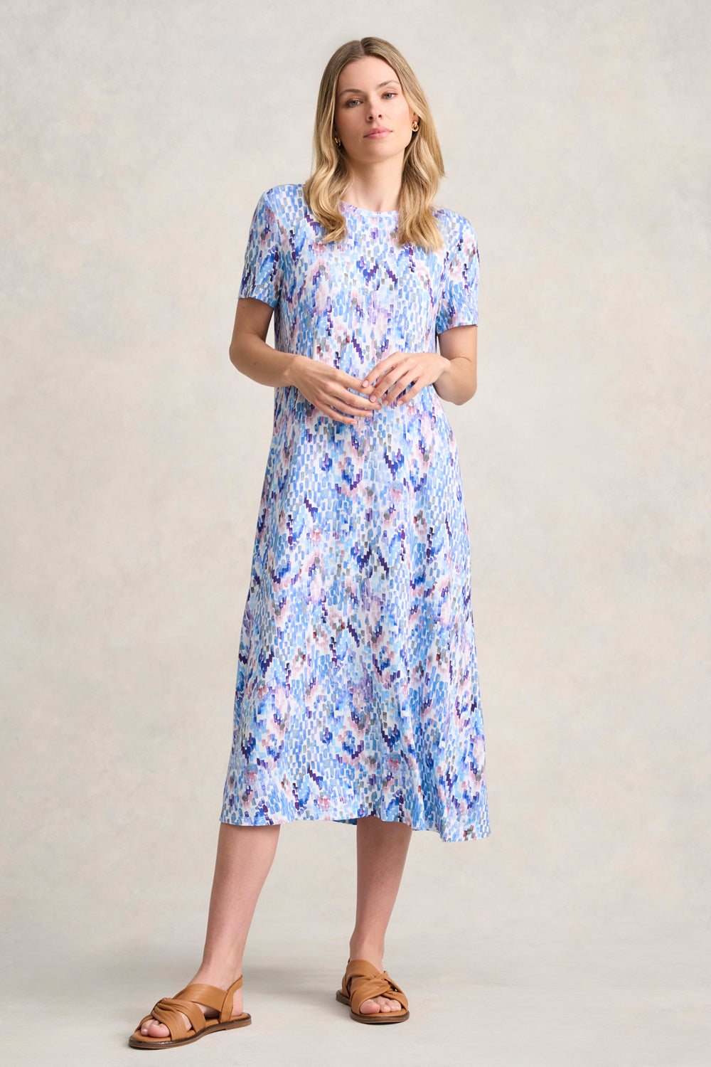 With a relaxed fit, our colourful Trapeze Jersey Dress is both easy to wear and to dress up or down depending on the occasion. Available in the joli Abstract Texture print, this midi-length beauty features a wide scoop neckline and comfortable summery short sleeve.