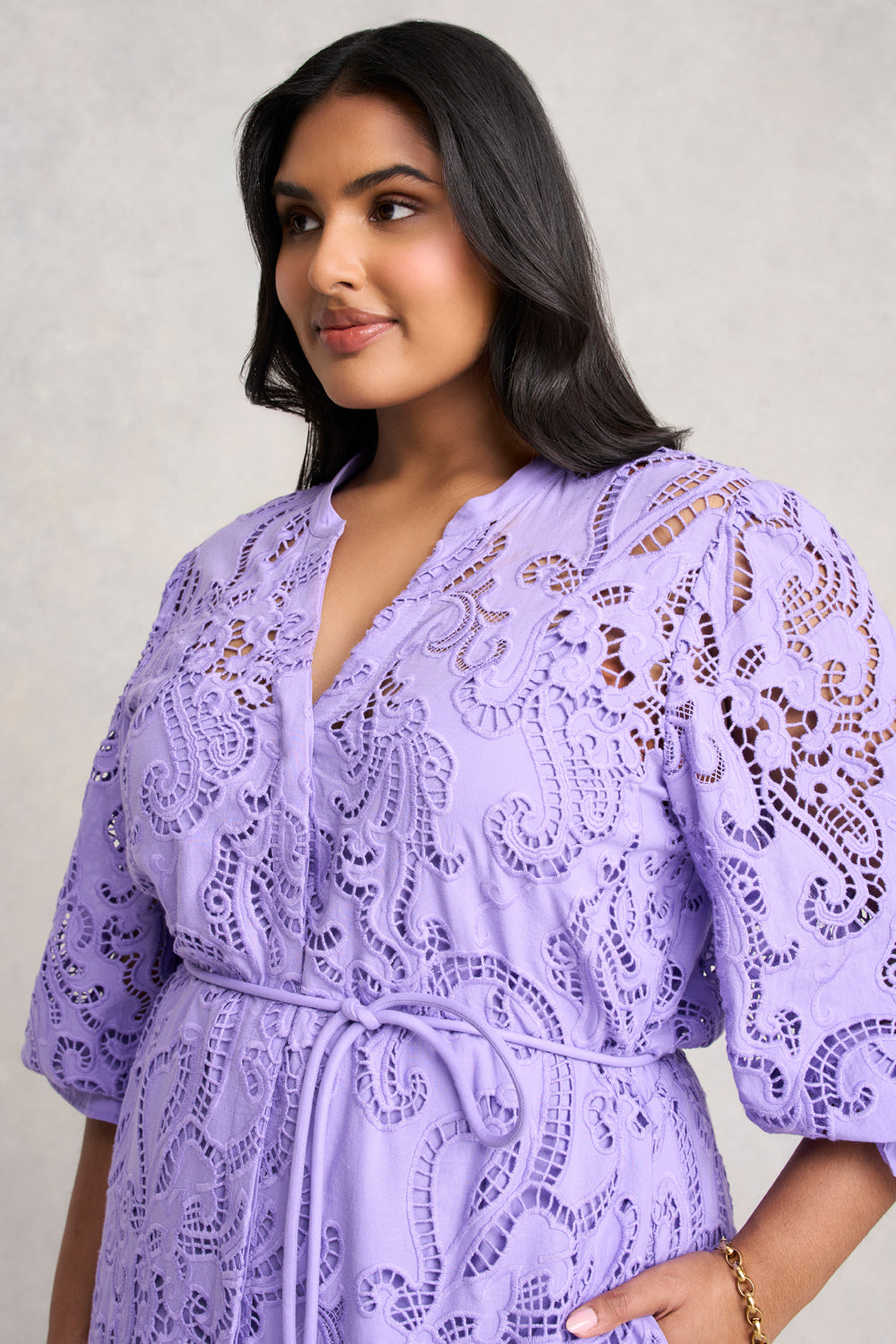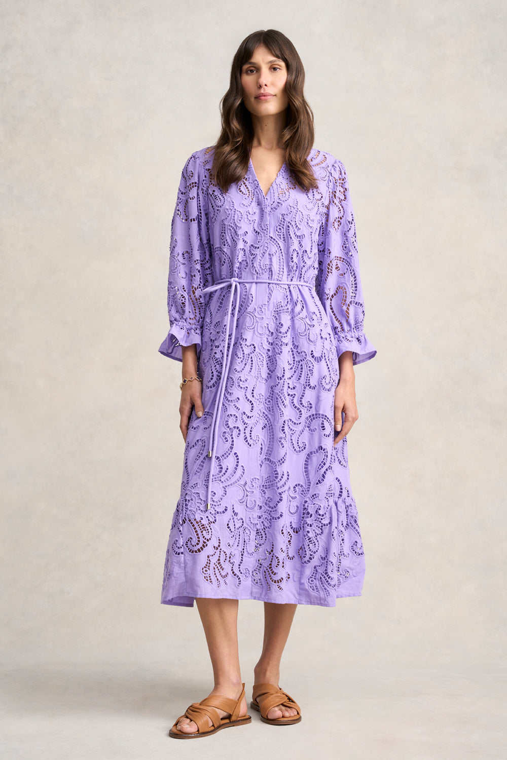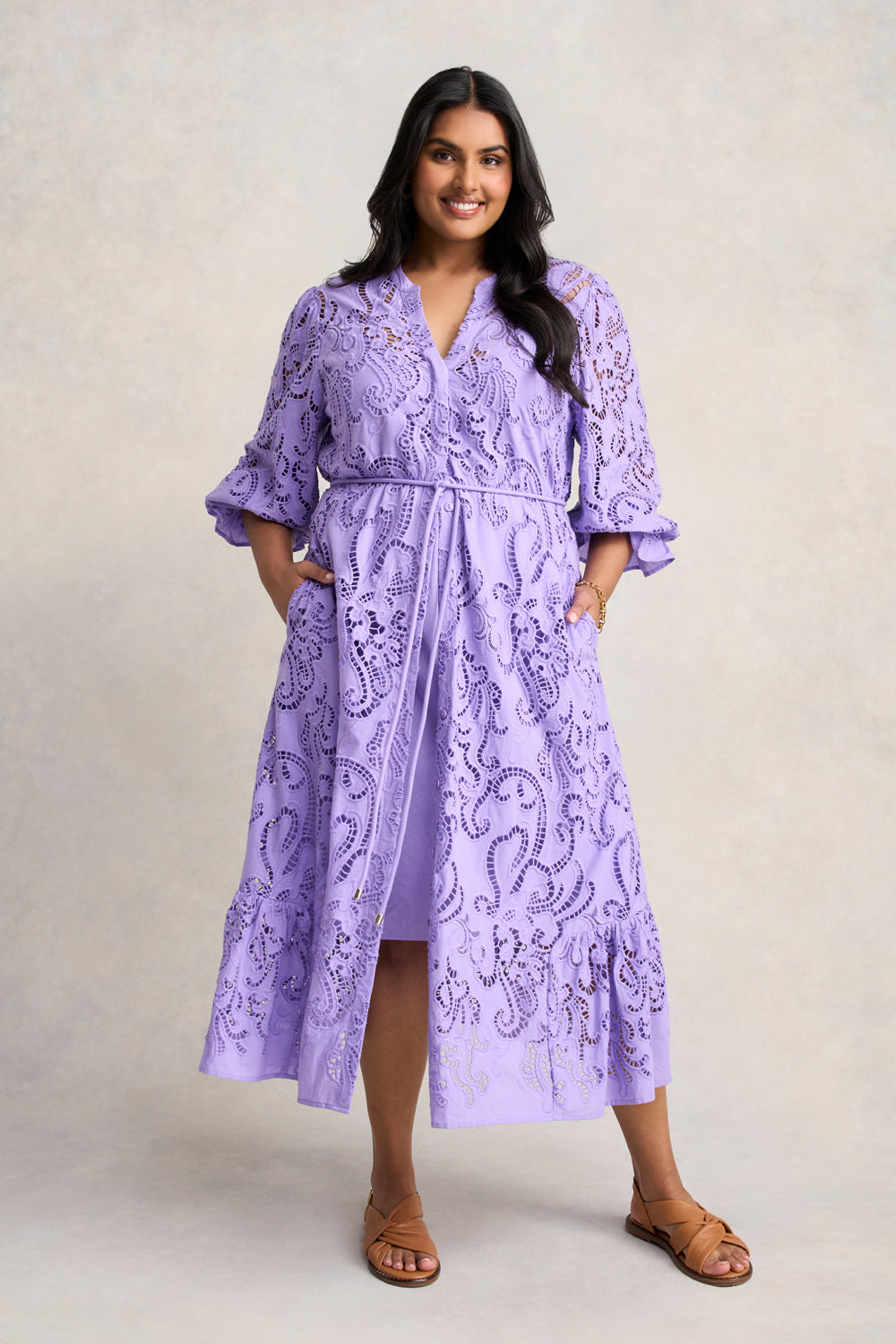 Part of our latest Étoile collection comes the delightful Broderie Lace Dress in Bright Lilac. Featuring playful, paisley-inspired cut-out detailing, this maxi-length dress is just perfect for event season. Details include a notch neckline, elasticated waist for a flattering fit and self-fabricated tubular rope belt with gold ends for that hint of opulence every event dress needs.