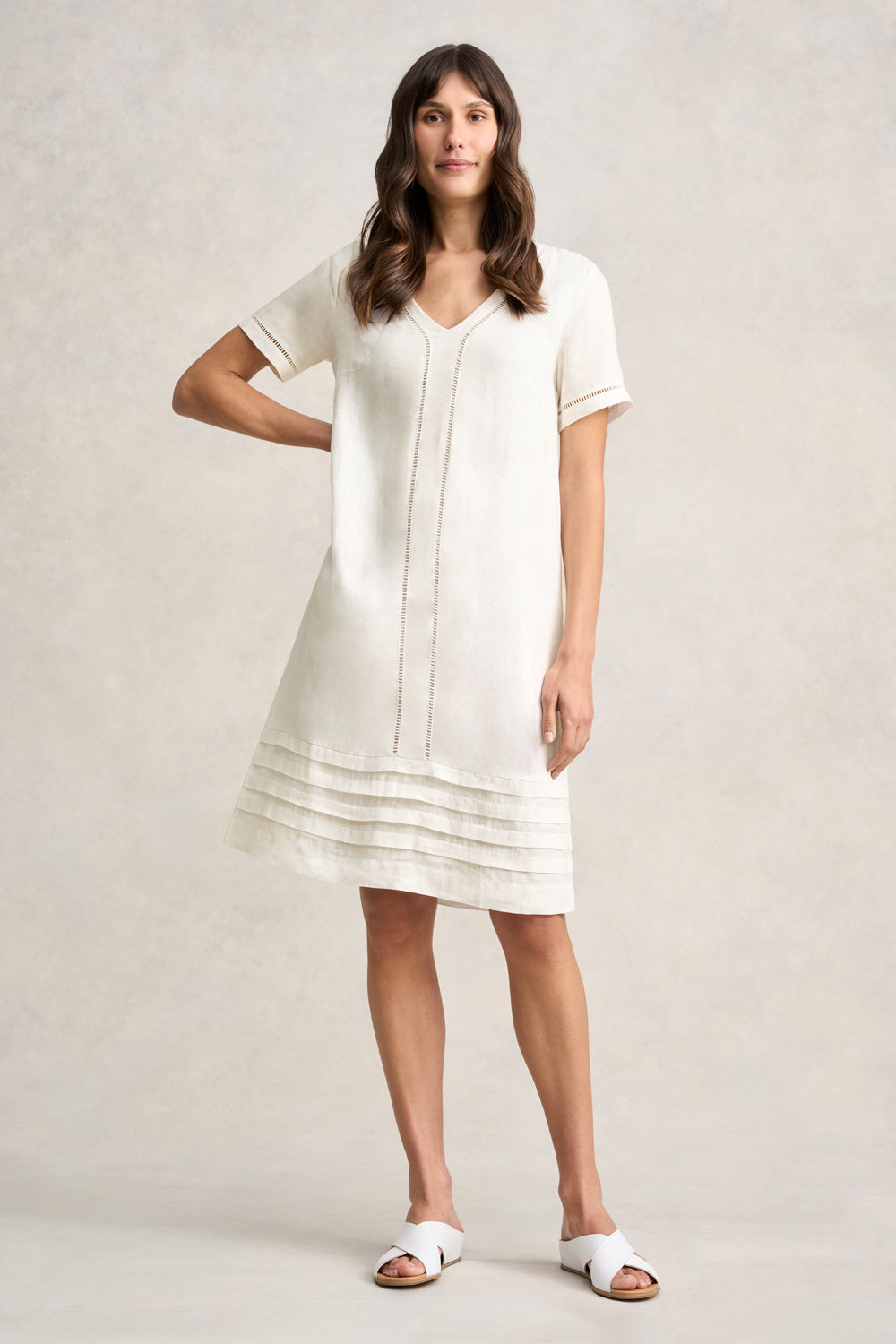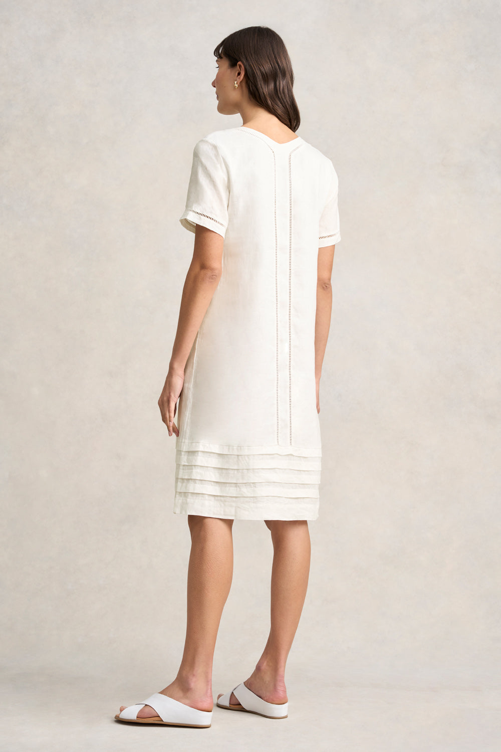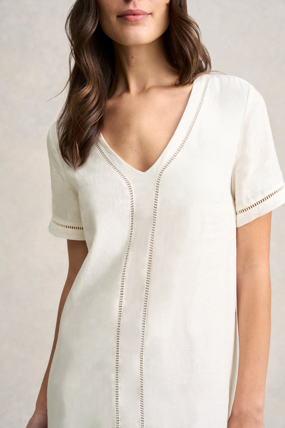 For a stylish day out look no further than our joli Ladder Trim Linen Dress in Chalk. A new style for Blue Illusion, this comfortable and flattering shift dress features an almond V neckline, ladder trim detailing and an easy knee-length. Add a touch of Parisian flair with a printed scarf or woven tote bag.