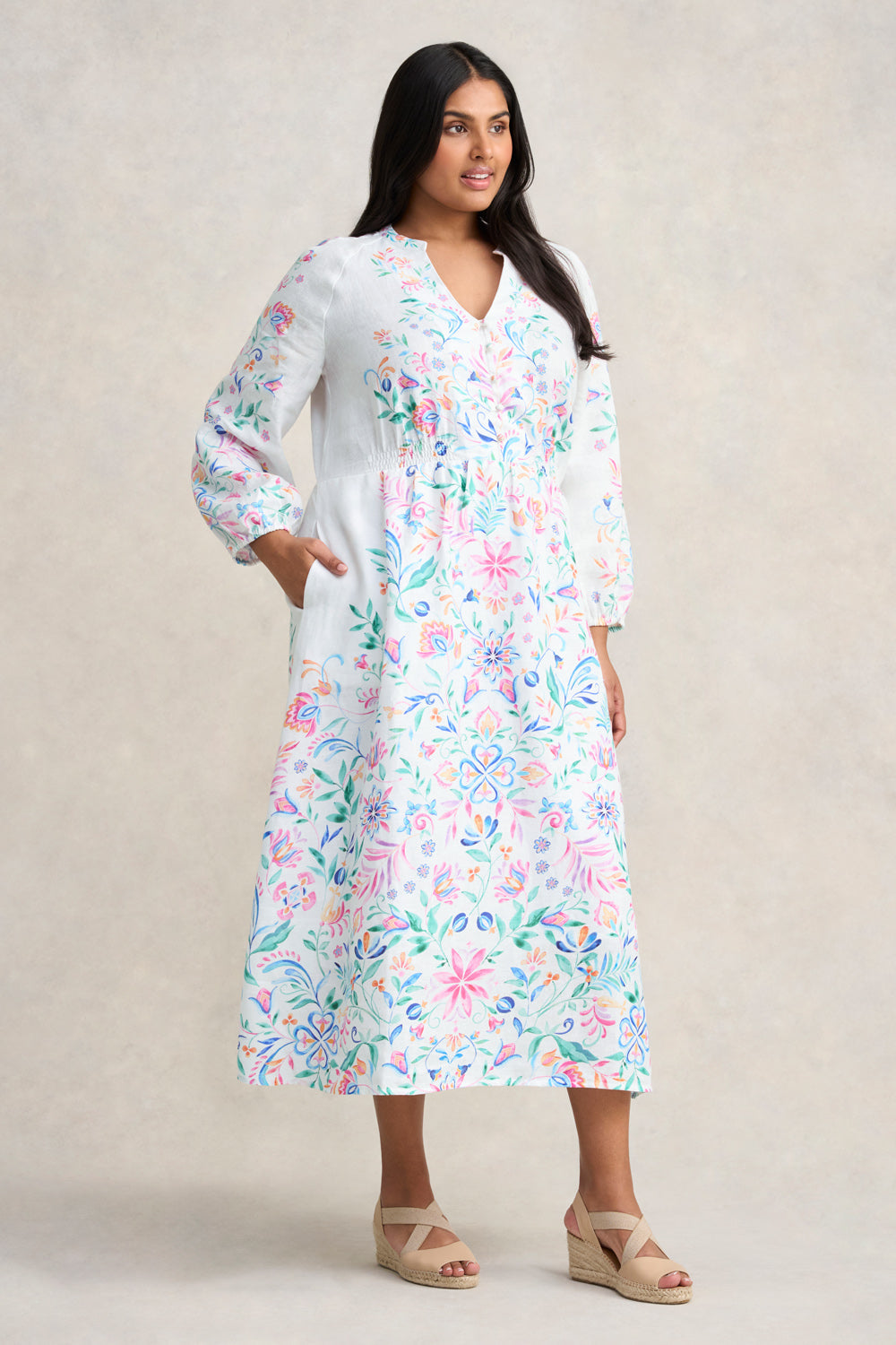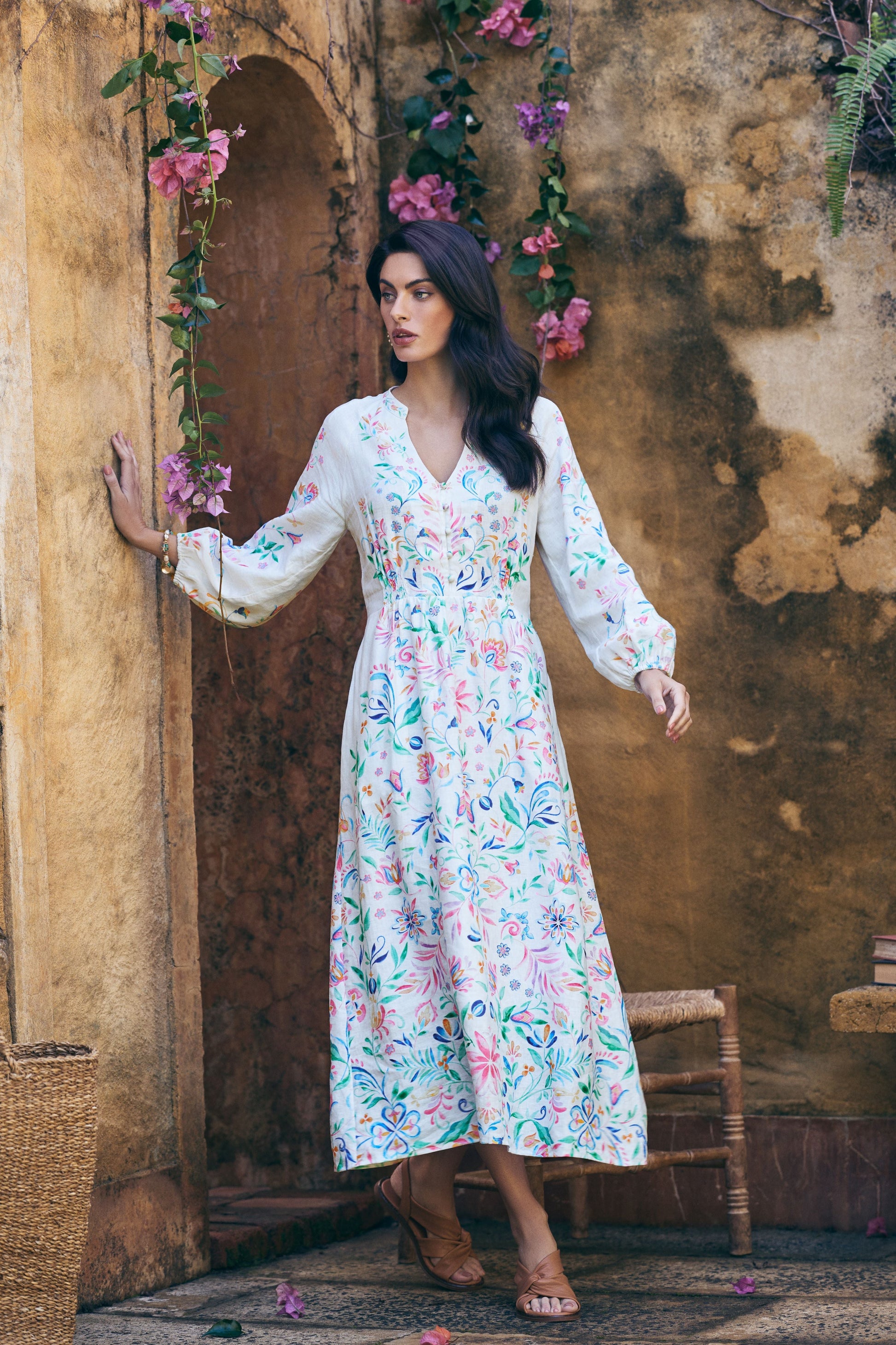 Playful meets ‘look-at-me’ in this charmant and twirl-worthy Border Print Midi Dress. Featuring the Australian designed, Jeanne Border print of our delightful Jeanne and Marguerite collection, this dress also features a flattering V neckline, self-fabricated buttons and shirring detail at the waist for elegant shaping. Dress it up with a stylish shoe like our Belle Metallic Strap Espadrille.