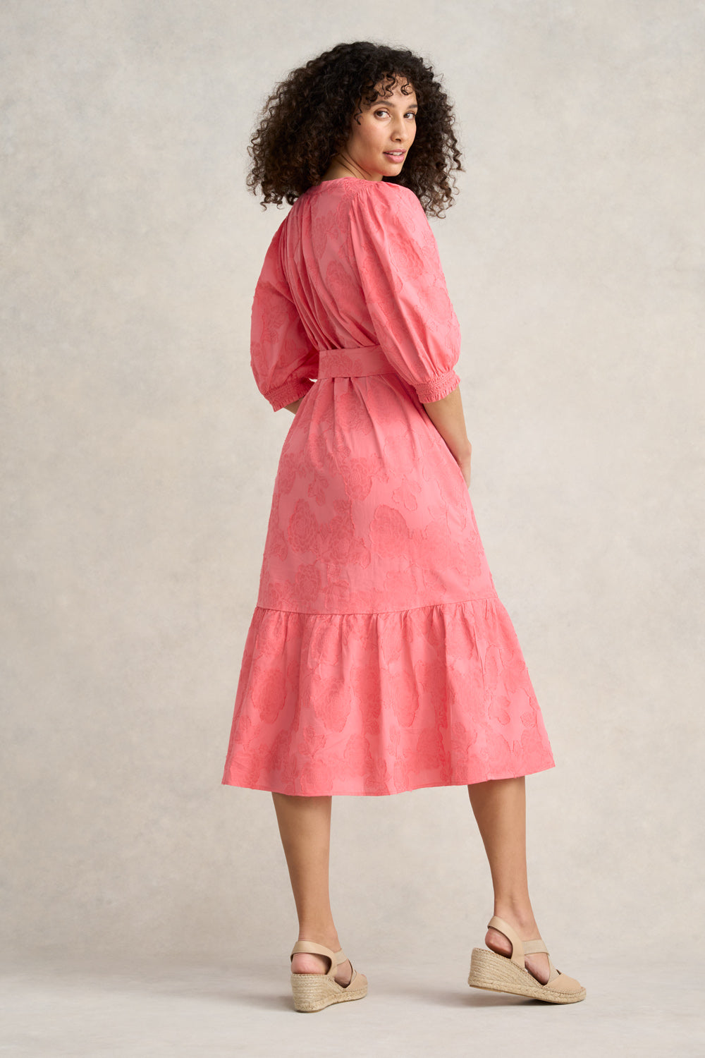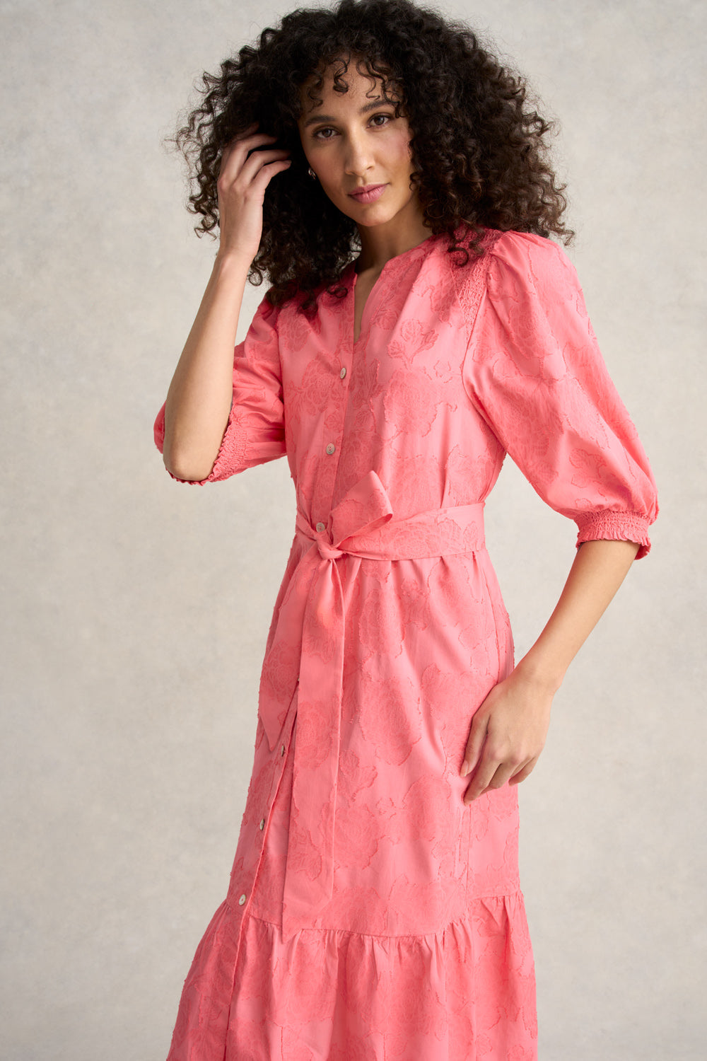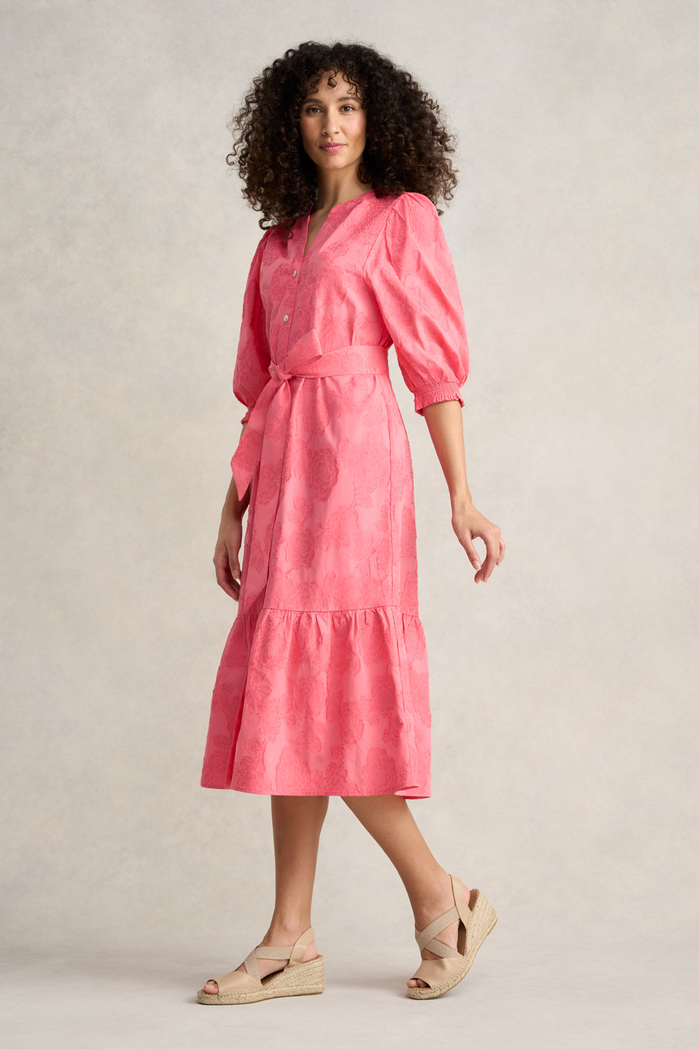 Bright and lively, our maxi-length Smock Detail Cotton Dress is ideal for spring outfitting. Available in energising Guava, it features an all-over floral jacquard clip, elbow-length sleeve and cutaway neckline. Wear it your way with the matching self-fabricated belt and add a sense of occasion with your favourite espadrille.