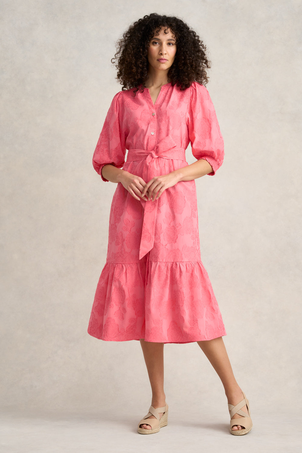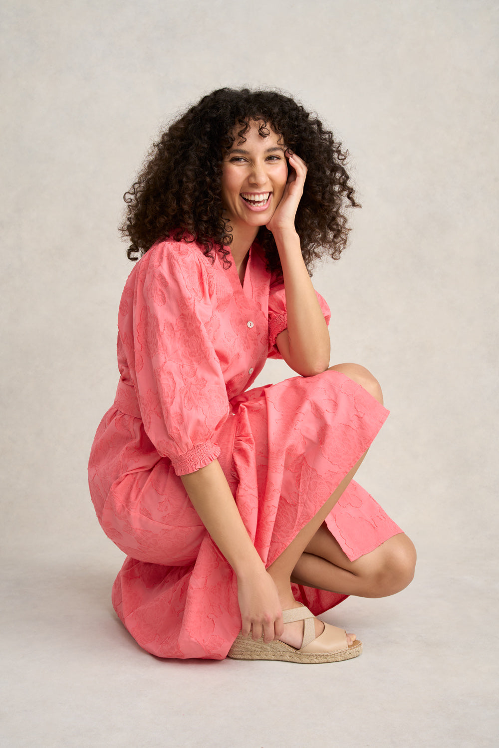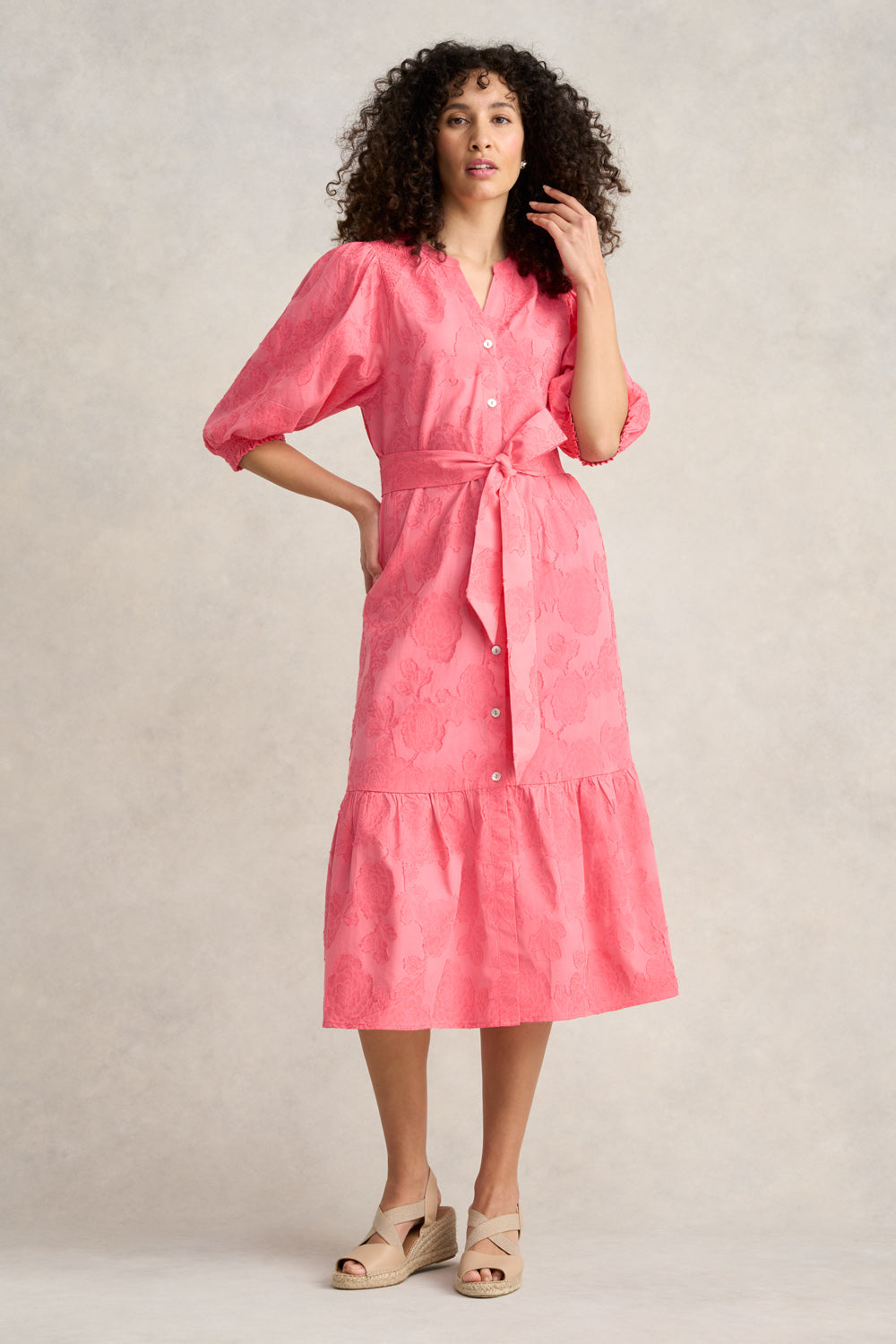 Bright and lively, our maxi-length Smock Detail Cotton Dress is ideal for spring outfitting. Available in energising Guava, it features an all-over floral jacquard clip, elbow-length sleeve and cutaway neckline. Wear it your way with the matching self-fabricated belt and add a sense of occasion with your favourite espadrille.