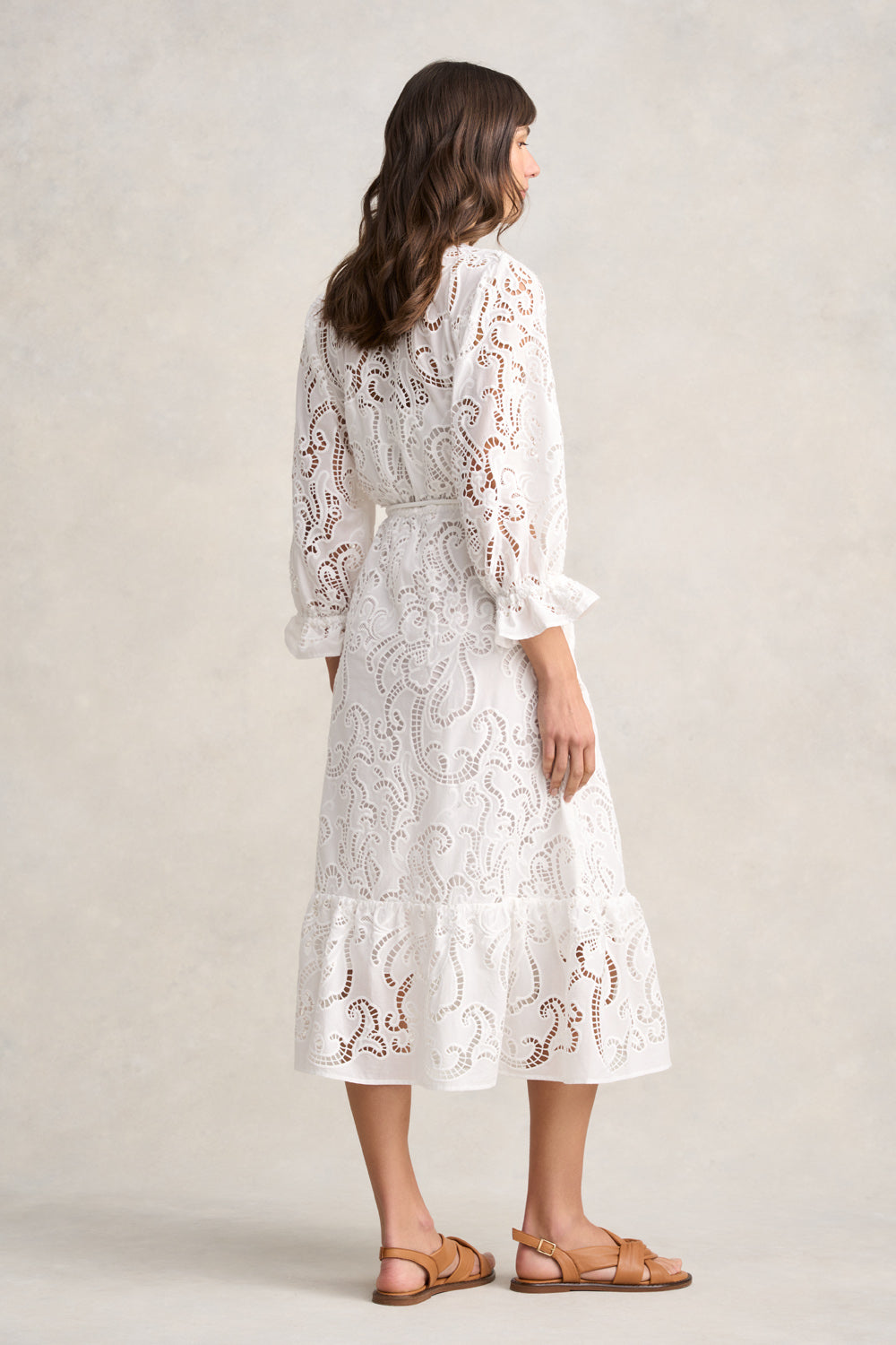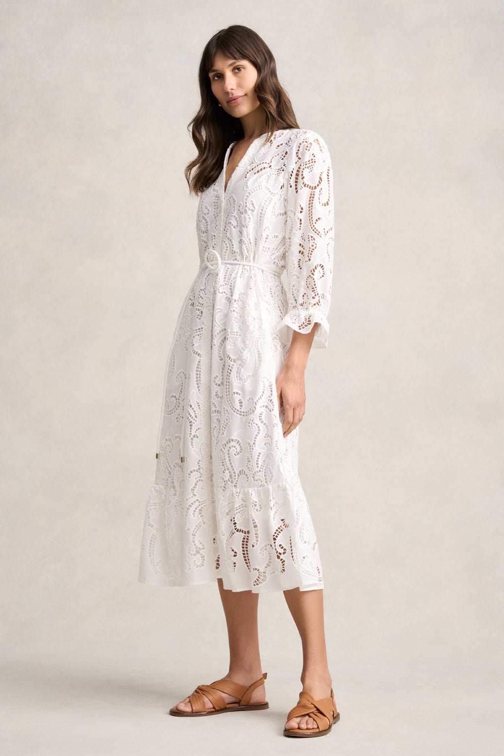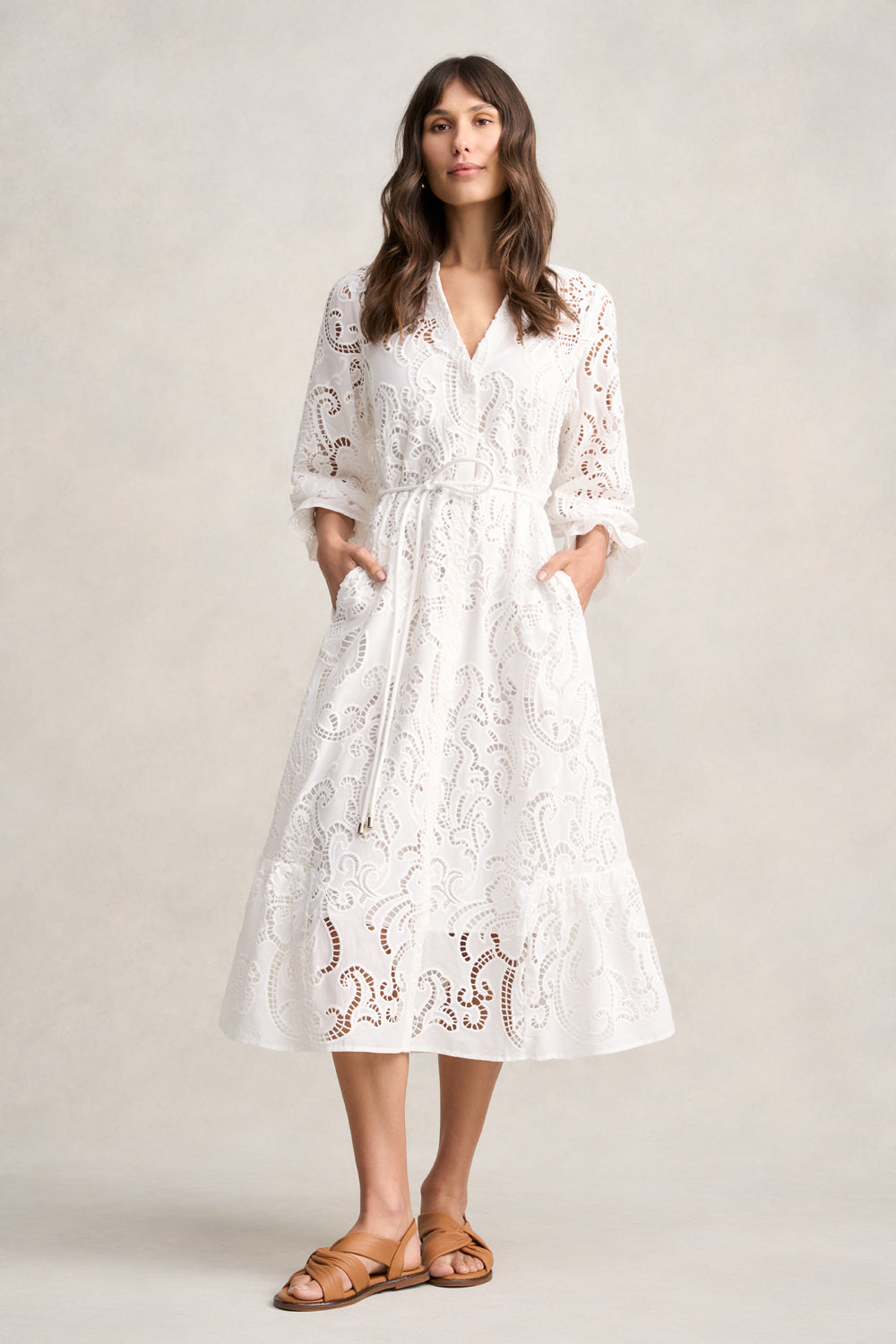Part of our glamorous, Villa La Pausa collection, comes the delightful Broderie Lace Dress now available in White. Featuring playful, paisley-inspired cut-out detailing, this maxi-length dress is perfect for summer events or special dinners on vacation. Details include notch neckline, elasticated waist for a flattering fit and a self-fabricated tubular rope belt with gold ends for that hint of opulence every event dress needs.